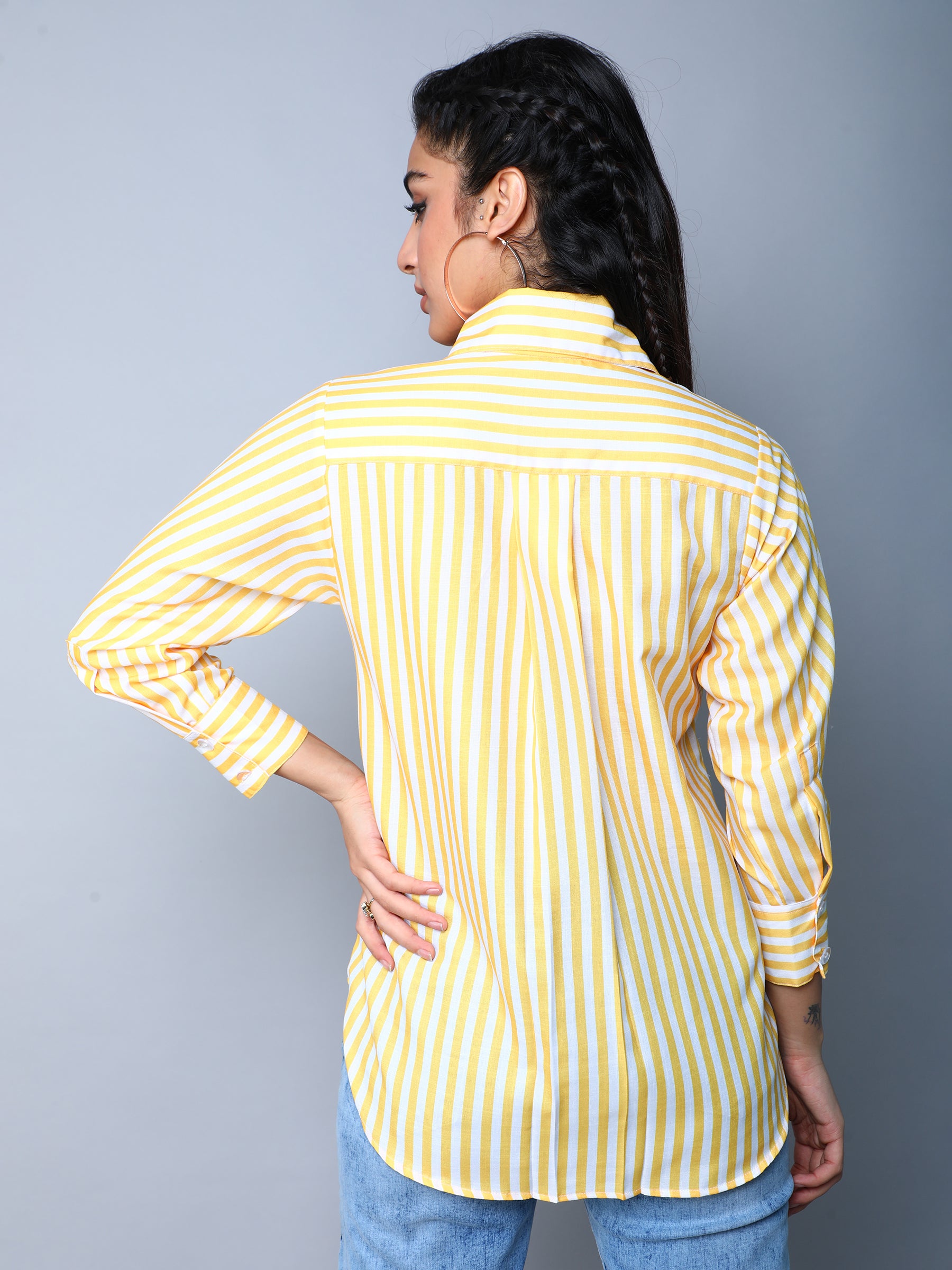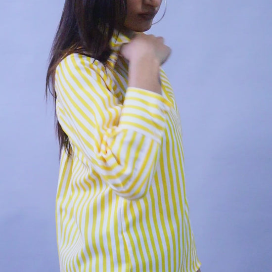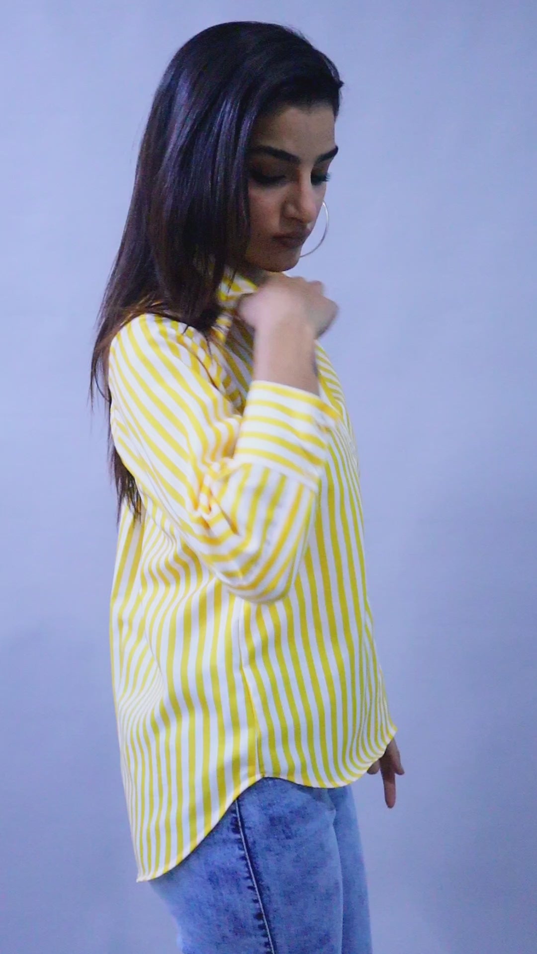 Make a bold statement with this classic Yellow and white striped shirt. Designed with vertical stripes to create a flattering silhouette, this button-down features a collared neckline and long sleeves for a polished yet casual look. Perfect for both work and off-duty styling, it’s a versatile wardrobe essential.