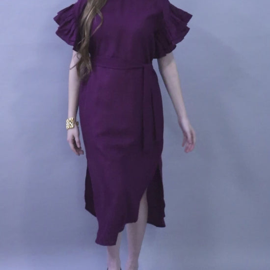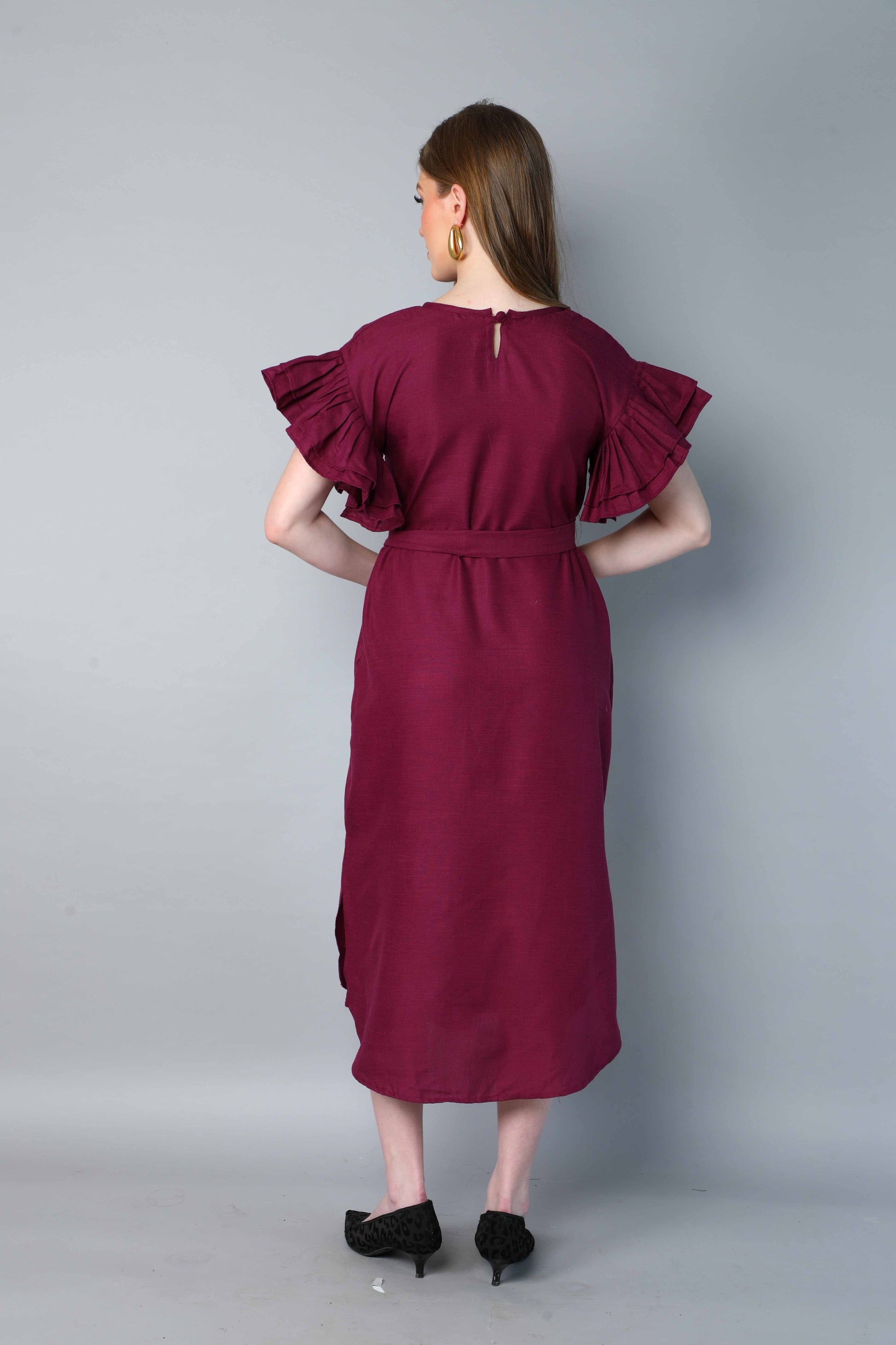 This vibrant cotton dress is a Bold yet Elegant wardrobe addition, featuring Double-Layered Pleated Ruffle Sleeves that add structure and movement to a clean, minimal silhouette. Designed with a round neckline, back keyhole opening, and side slits, it balances sophistication with all-day comfort. The detachable fabric belt allows you to wear it cinched at the waist or loose for a more relaxed fit.