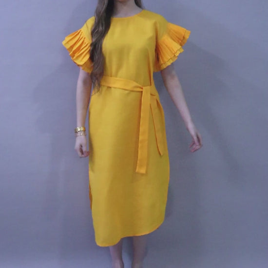 Double-Layered Pleated Ruffle Sleeve Dress -Yellow
