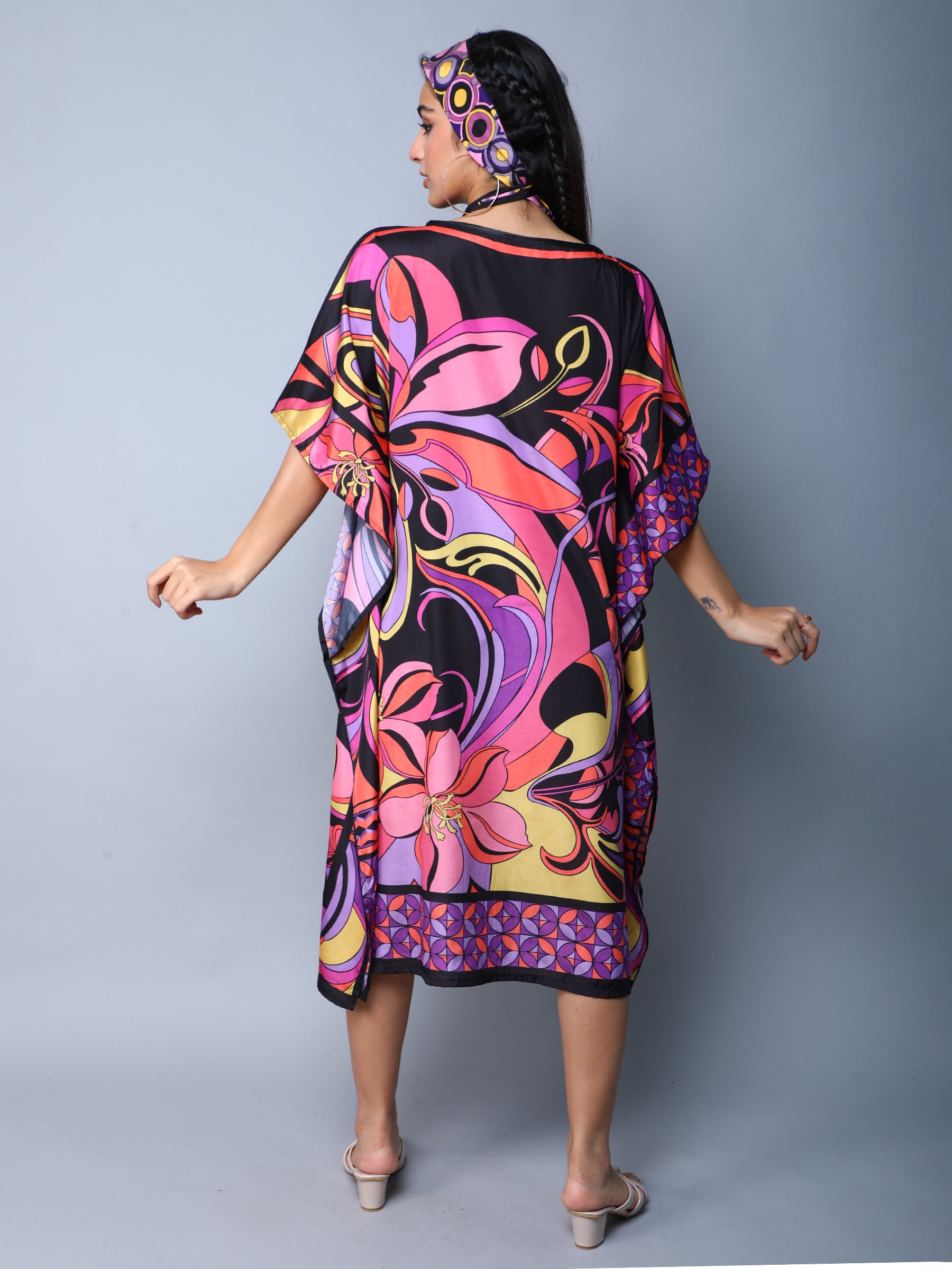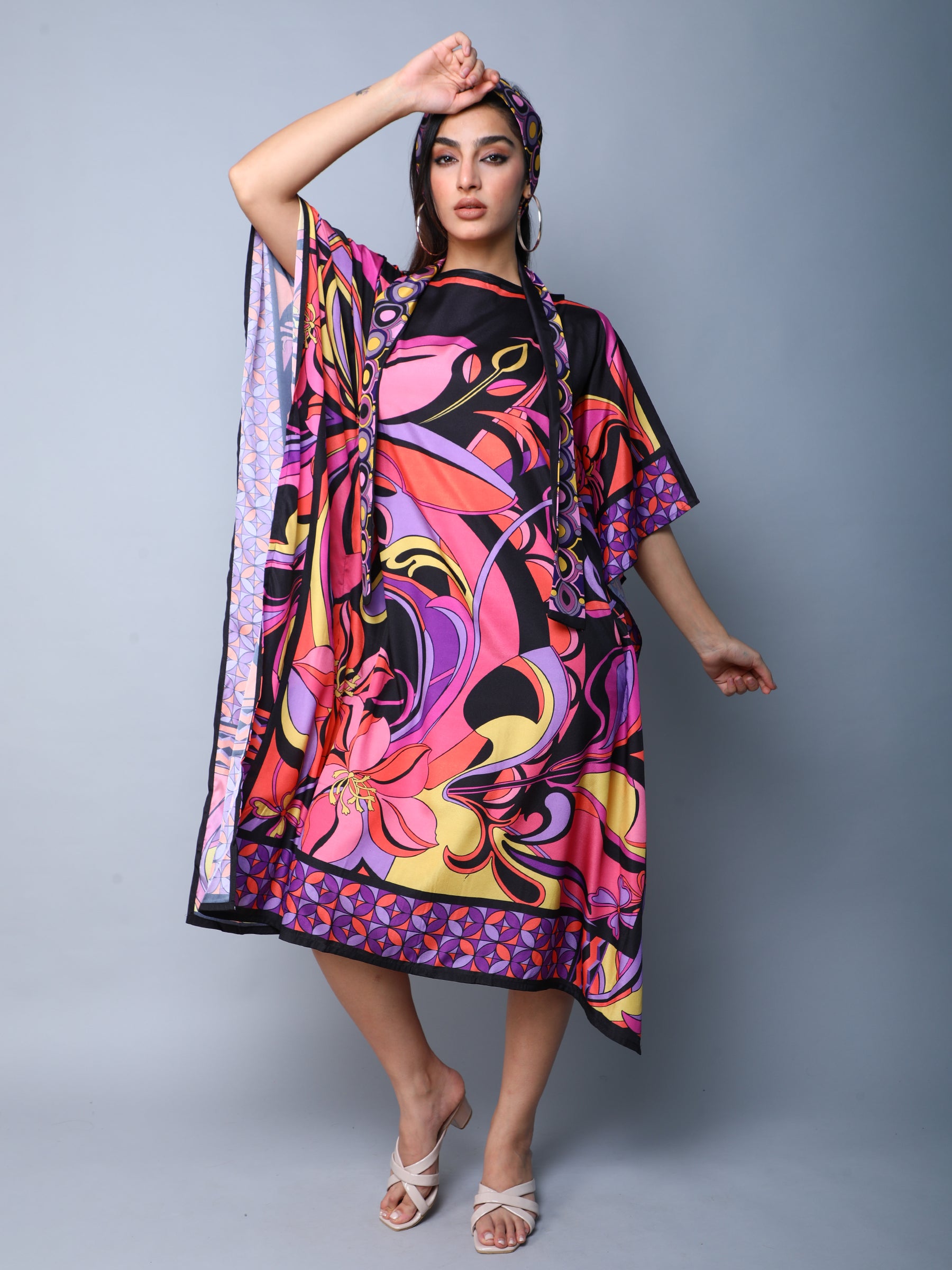 Turn heads with this luxurious abstract print satin kaftan dress, designed for effortless elegance and bold style. Featuring a vibrant mix of Colors in a baroque-inspired print, this flowy dress is perfect for both upscale events and fashion-forward everyday wear.
