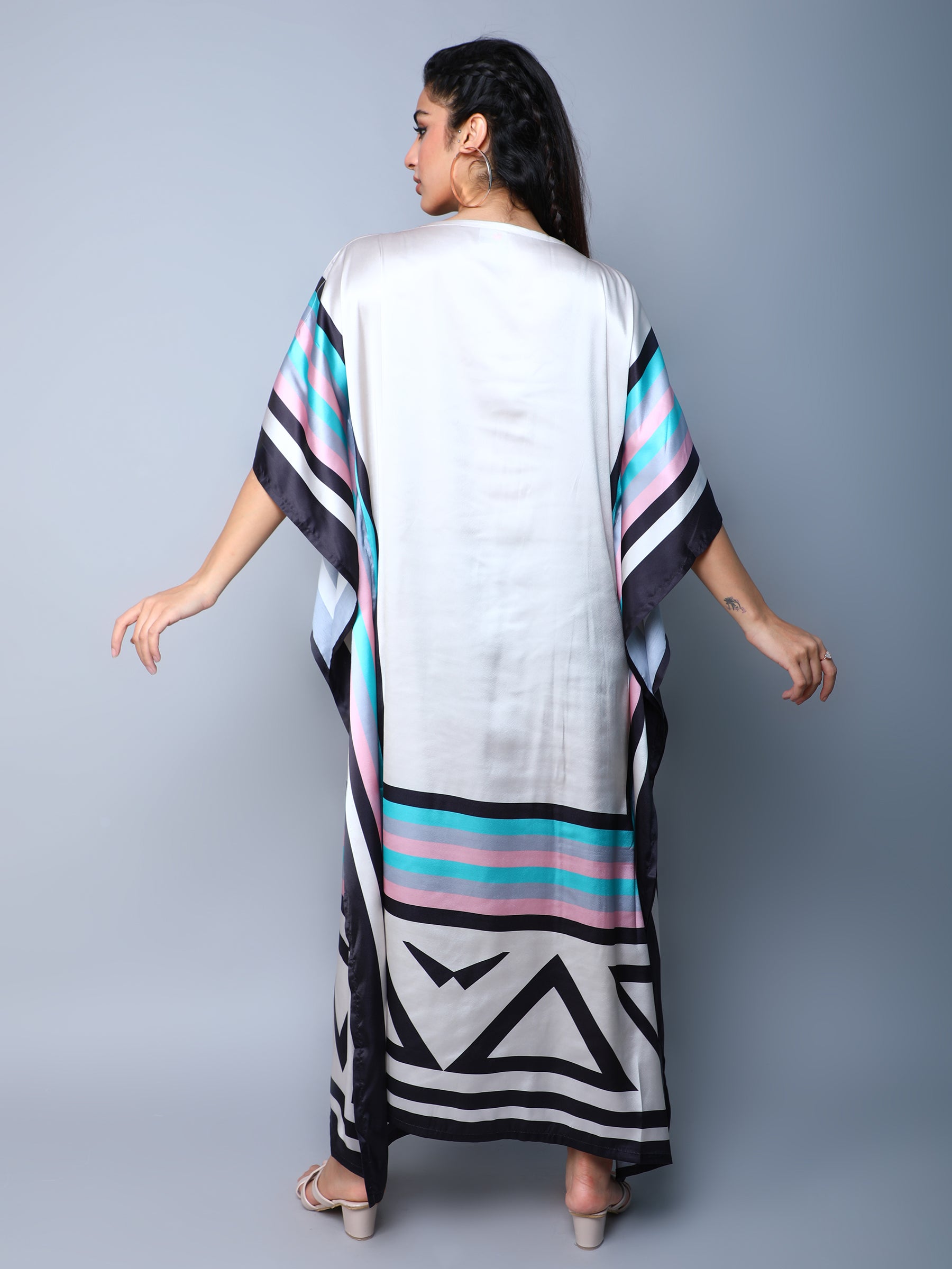 Elevate your wardrobe with this elegant satin kaftan dress, designed to blend modern style with effortless comfort. Crafted from high-quality satin, the dress features a lustrous silver base with bold geometric prints in black, aqua blue, and blush pink. The loose, flowy silhouette and wide sleeves make it perfect for both casual luxe and special occasions.