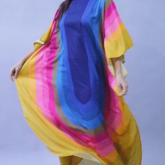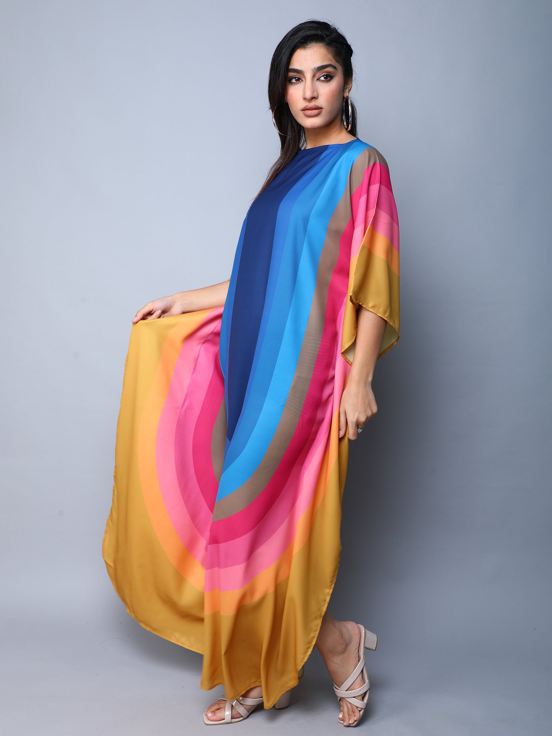 turn heads effortlessly with this stunning Multicolor Kaftan dress that brings bold, artistic flair to contemporary fashion. Featuring a rich blend of deep blue at the center, transitioning into vibrant shades of pink, mustard, and teal in a rainbow-inspired gradient, this dress is a celebration of color and comfort. Designed in a smooth satin fabric, it flows beautifully, making it perfect for both casual outings and elevated evenings.