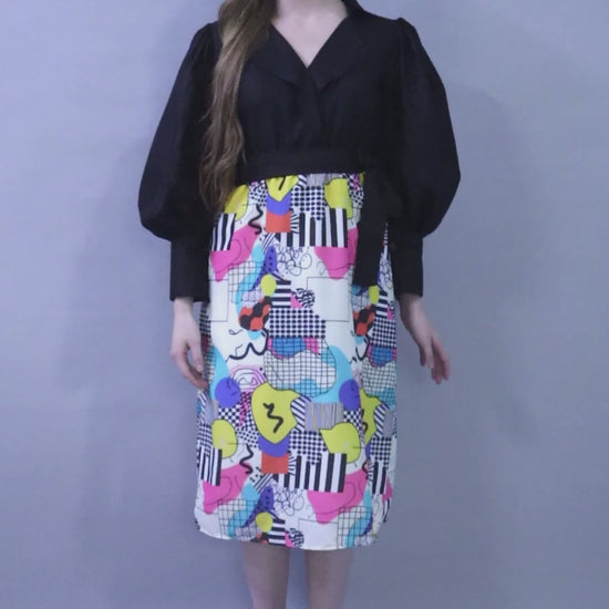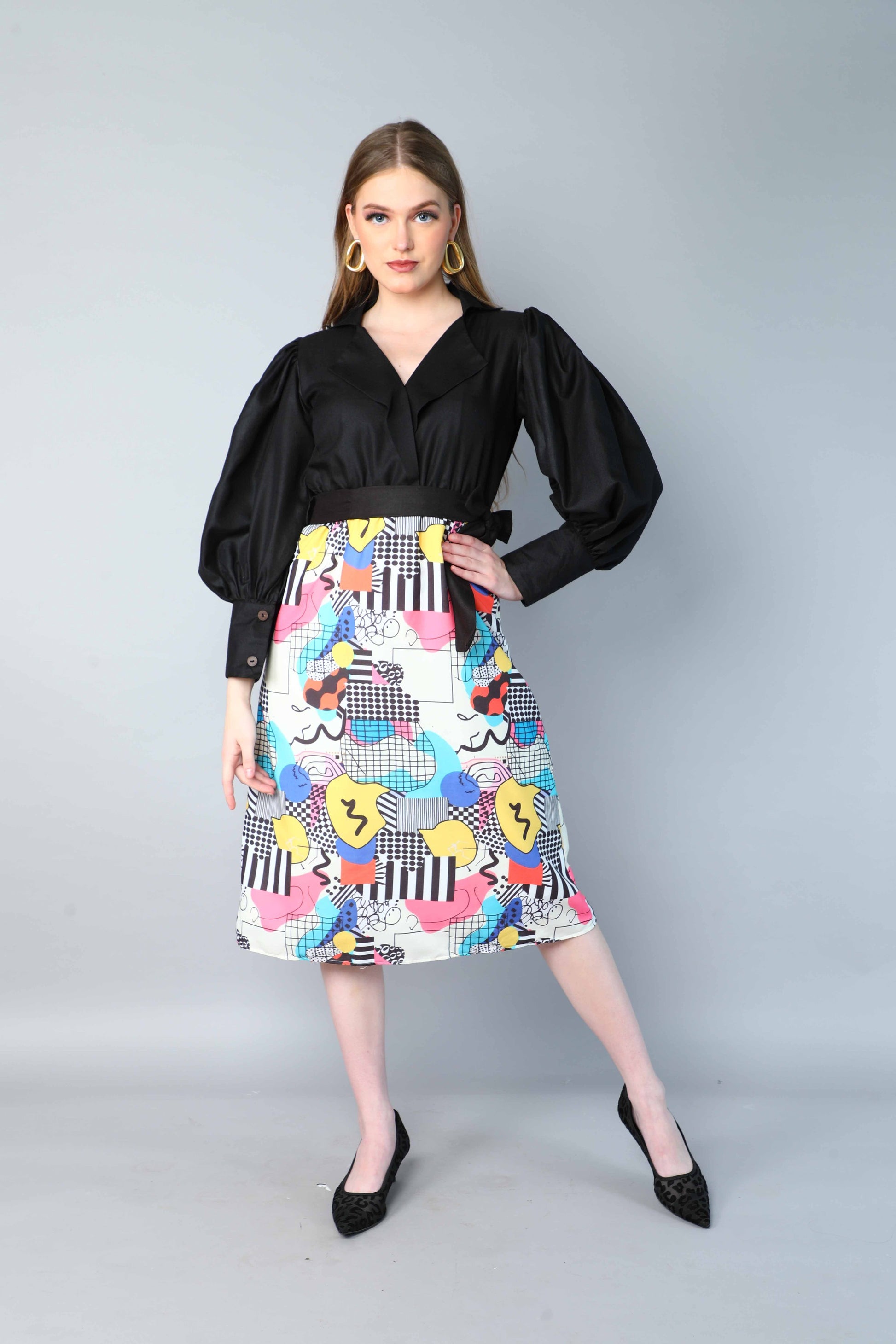 Turn heads in this chic black and multicolor printed one-piece dress. Featuring a solid black puff-sleeve top and a vibrant abstract printed skirt, this dress is the perfect blend of elegance and fun. The tie-up waist belt enhances your shape, making it ideal for both day and evening occasions.