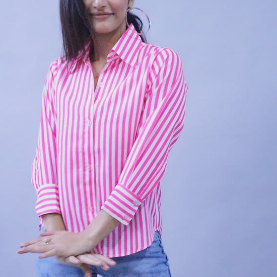 Make a bold statement with this classic Pink and White striped shirt. Designed with vertical stripes to create a flattering silhouette, this button-down features a collared neckline and long sleeves for a polished yet casual look. Perfect for both work and off-duty styling, it’s a versatile wardrobe essential.