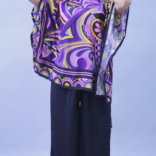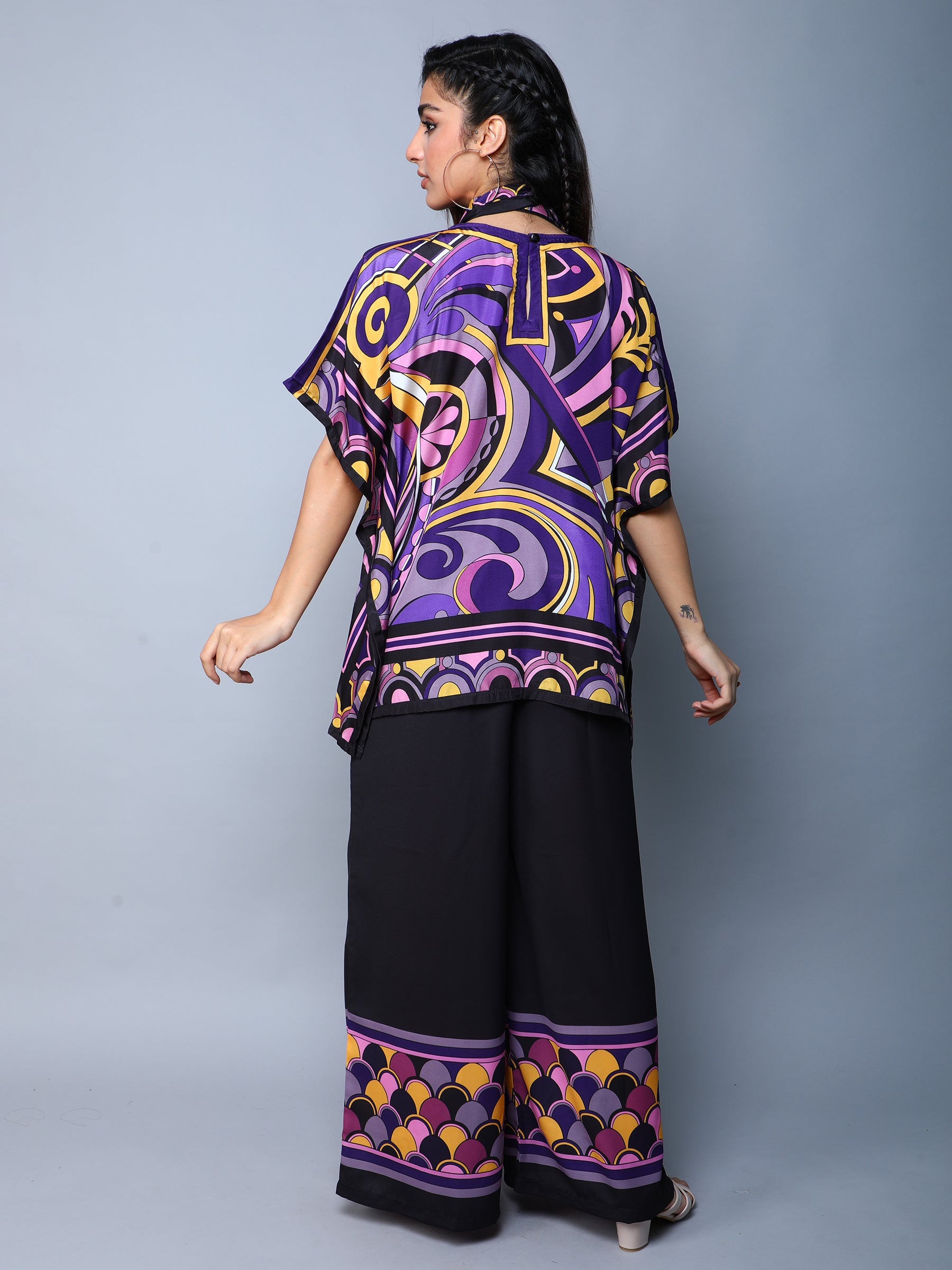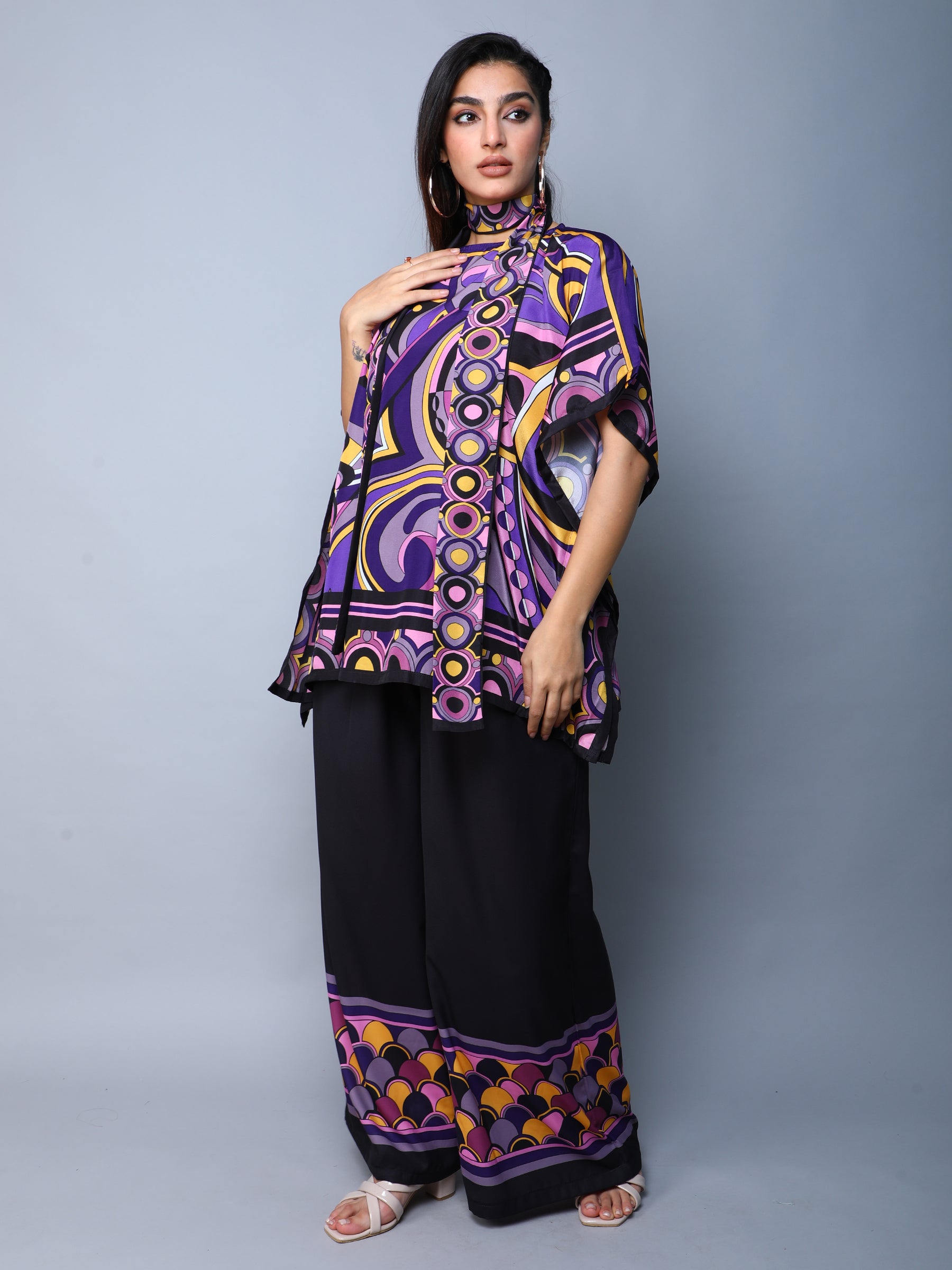 Turn heads with this bold and vibrant printed co-ord set. Featuring a flowy cape-style top and wide-leg trousers, this outfit blends retro-inspired prints with contemporary tailoring. The multicolor geometric and floral design in purple, black, yellow, and pink creates a striking visual appeal, while the relaxed silhouette ensures comfort and style. Perfect for parties, festive occasions, and statement casual looks.