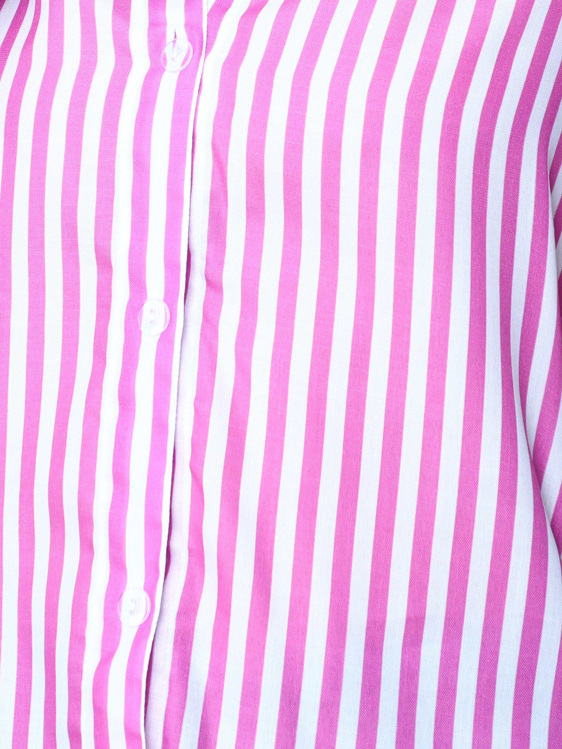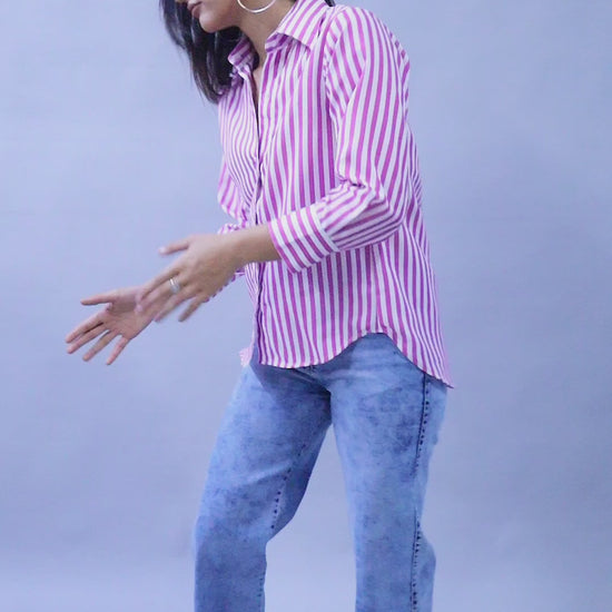 Make a bold statement with this classic purple and white striped shirt. Designed with vertical stripes to create a flattering silhouette, this button-down features a collared neckline and long sleeves for a polished yet casual look. Perfect for both work and off-duty styling, it’s a versatile wardrobe essential.