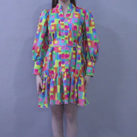 Turn heads in this vibrant retro-inspired mini dress! Featuring a bold geometric print in bright pops of pink, yellow, turquoise, and green, this dress is the perfect statement piece for any occasion. Designed with voluminous puff sleeves, a flattering belted waist, and a playful ruffled hem, it combines fun, flair, and comfort effortlessly.