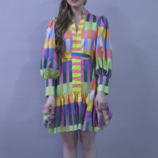 Bright, bold, and beautiful – this multicolor striped mini dress is a statement-maker for any occasion. Designed with striking vertical and diagonal stripes in vibrant hues of pink, yellow, turquoise, orange, and green, it brings playful energy to your wardrobe. The voluminous puff sleeves and belted waist create a flattering silhouette, while the ruffled hem adds a fun, feminine touch.
