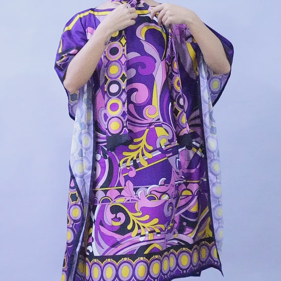 Elegant Abstract Print Satin Kaftan Dress – Purple Fusion
