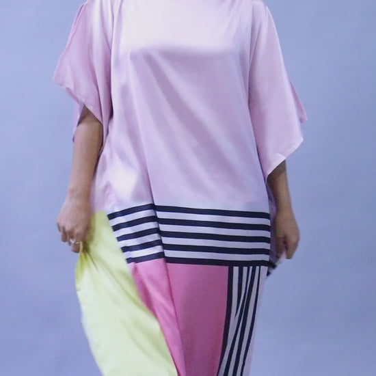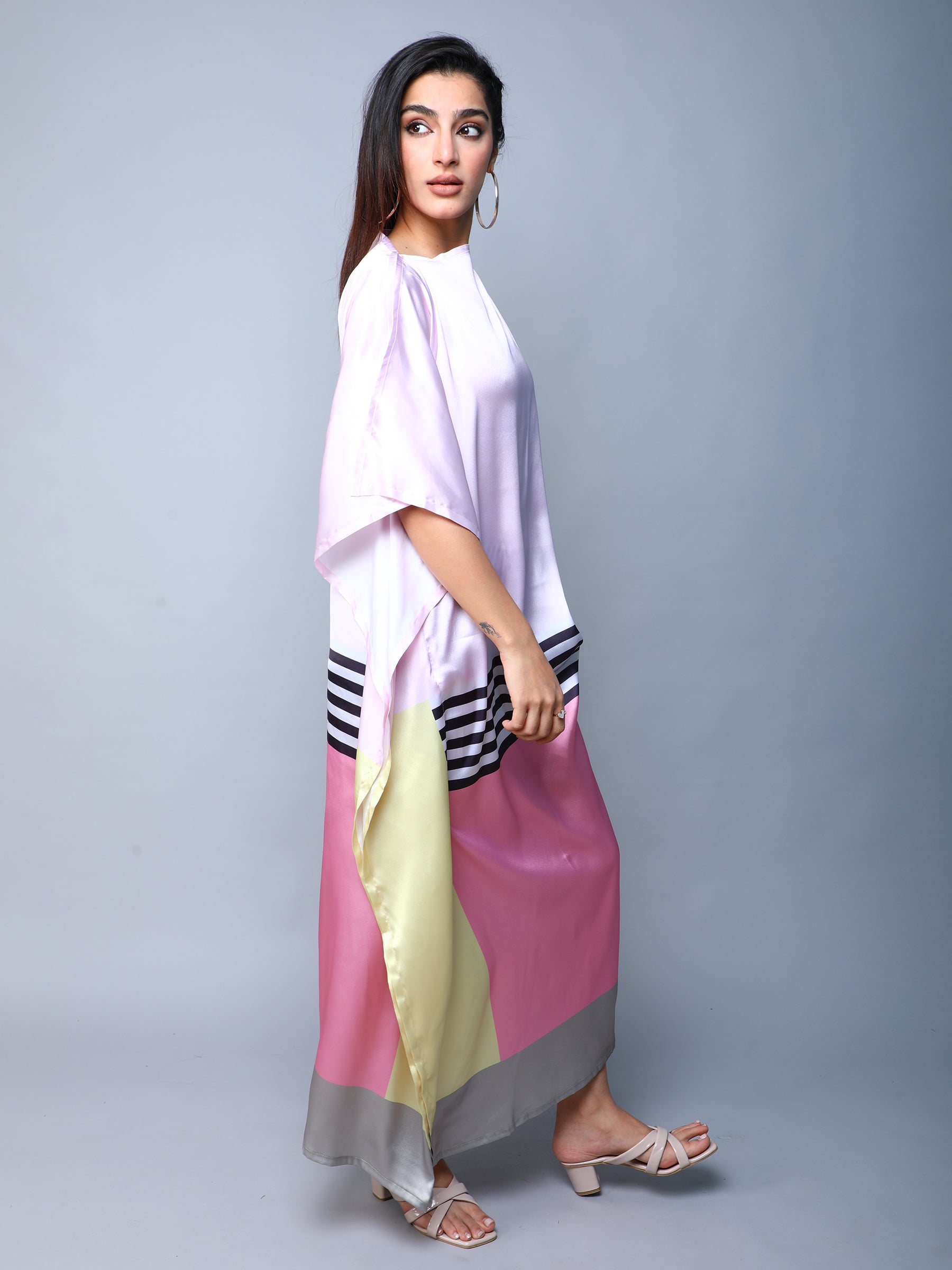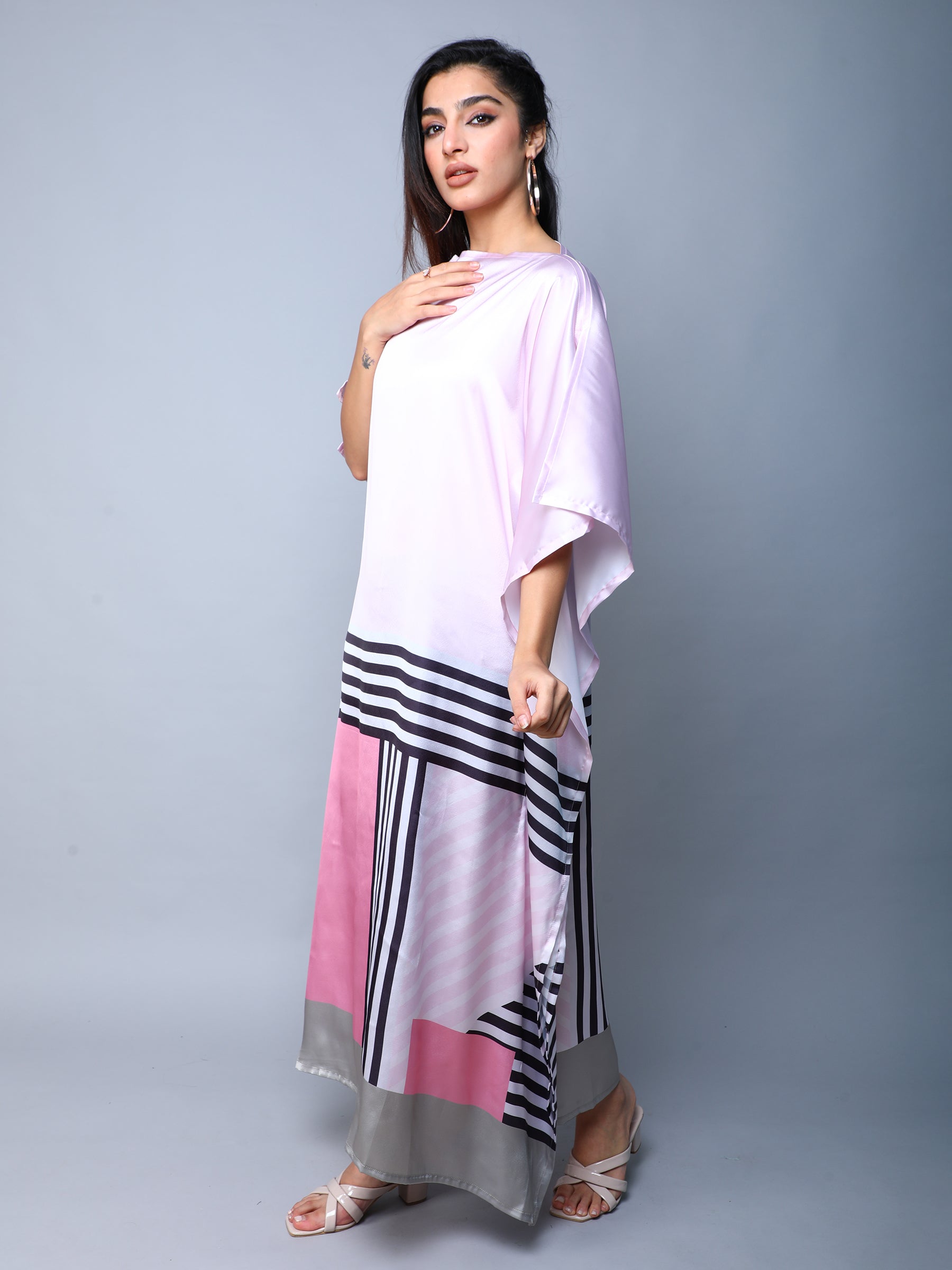 Elevate your wardrobe with this elegant satin kaftan dress, designed to blend modern style with effortless comfort. Crafted from high-quality satin, the dress features a lustrous Blush Pink base with bold geometric prints. The loose, flowy silhouette and wide sleeves make it perfect for both casual luxe and special occasions.