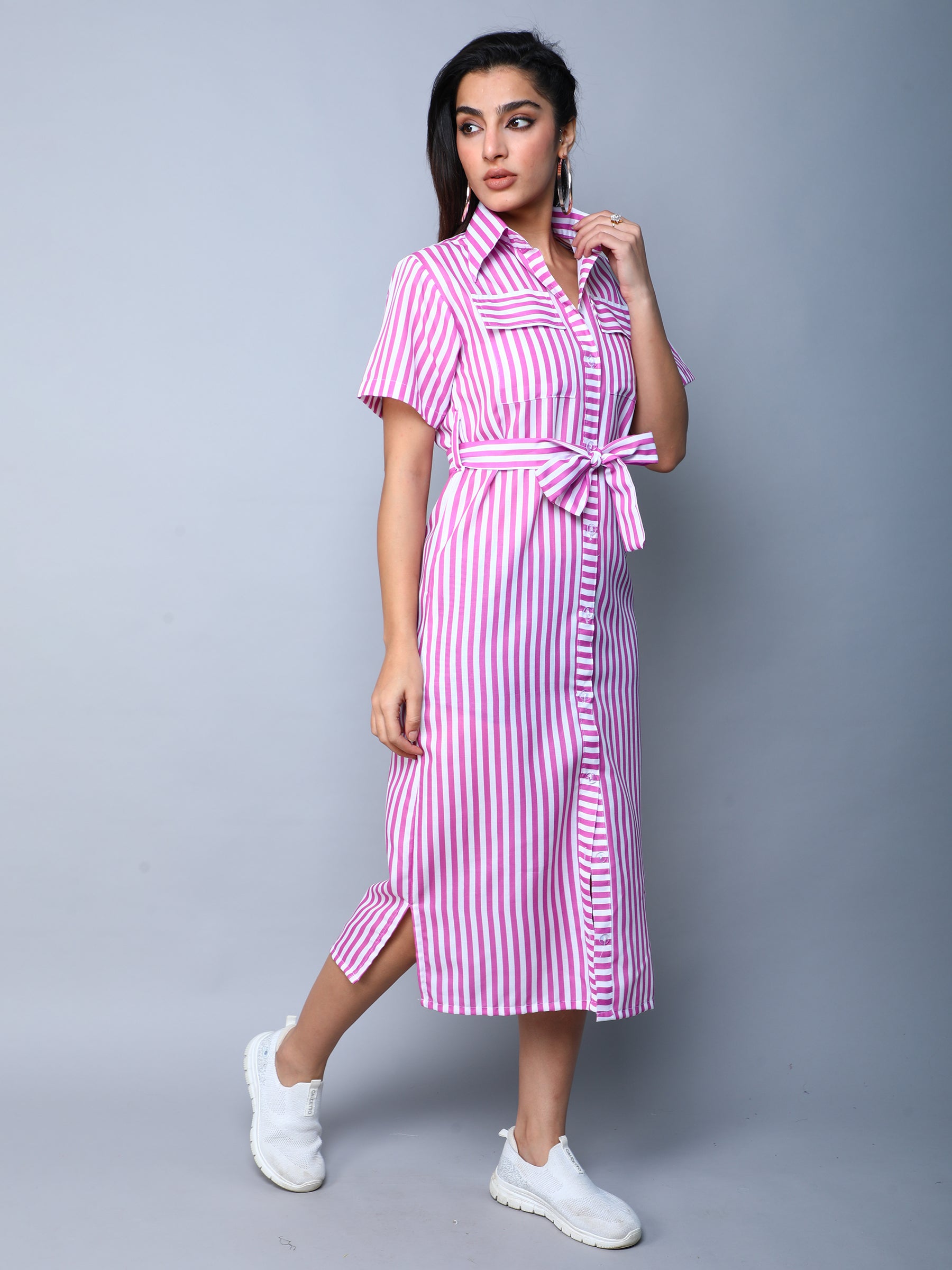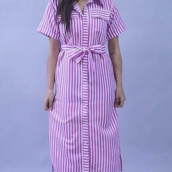 Refresh your wardrobe with this effortlessly chic Striped Cotton Shirt Dress, designed for Comfort and Style. Featuring a Classic Collared Neckline, button-down front, and two chest pockets, it’s both functional and fashionable. The removable waist belt allows you to adjust the fit to your liking, creating a flattering silhouette. Crafted from 100% breathable cotton, it’s perfect for everyday wear—from the Office to Weekend outings.