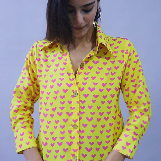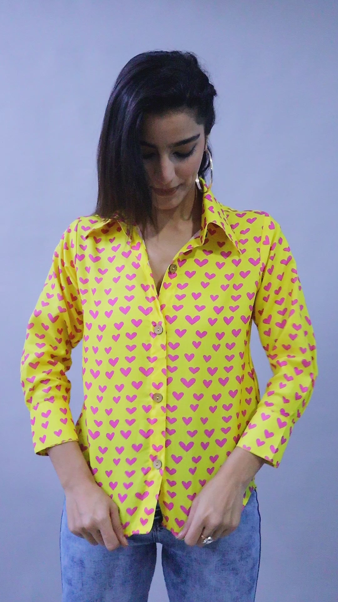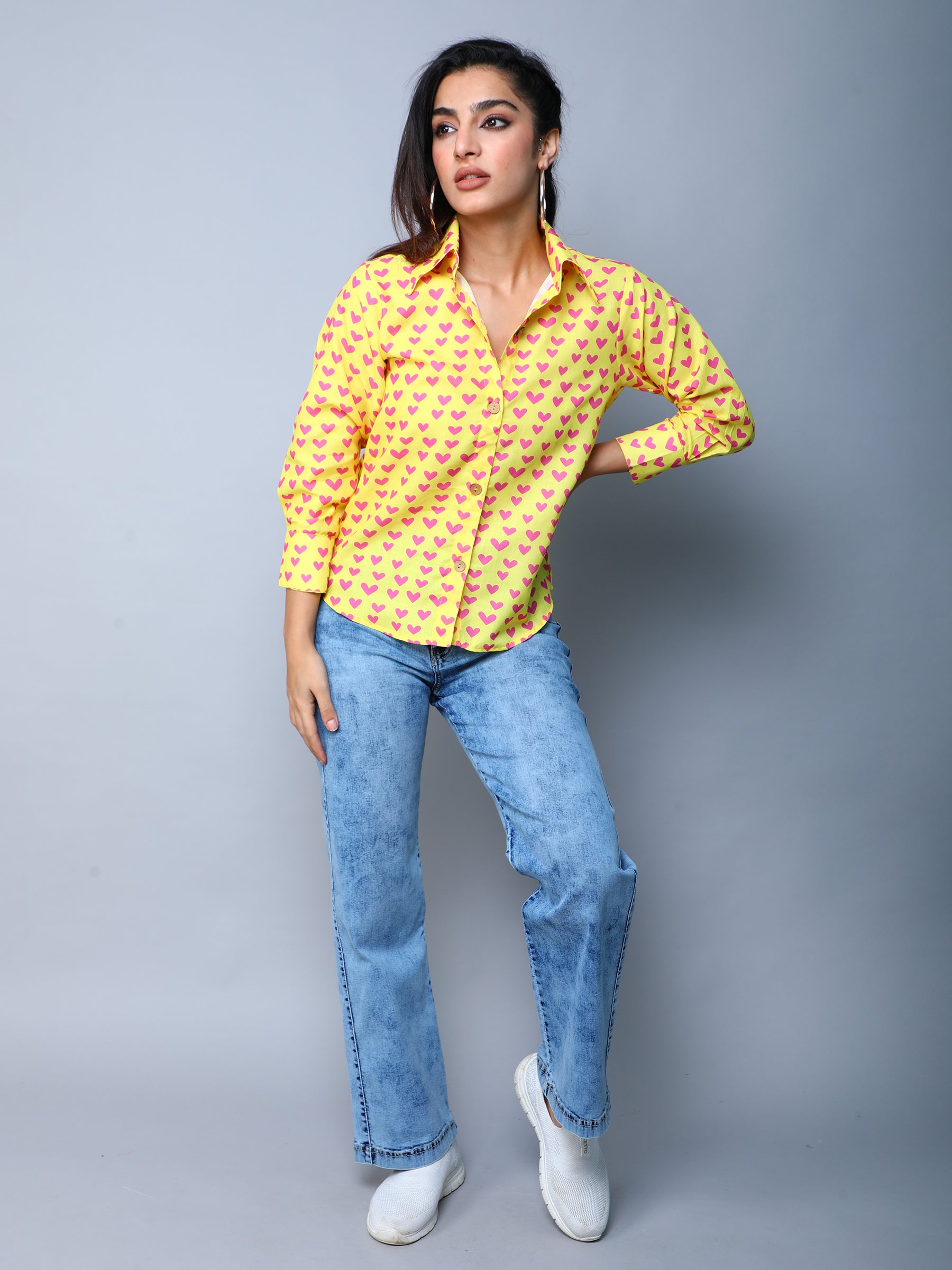 Add a pop of color and charm to your wardrobe with this playful yellow shirt featuring an all-over pink heart print. Designed with a collared neckline and button-down front, this shirt is perfect for casual outings, weekend get-togethers, or fun daytime looks. Its vibrant design makes it a statement piece while keeping you comfortable and stylish.